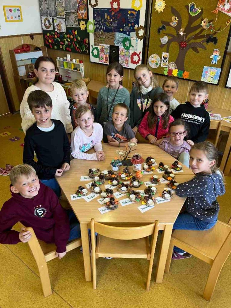 Podzimní měsíc říjen nám přinesl spoustu radovánek v přírodě, ale také mnoho zajímavého tvoření. Vyzkoušeli jsme si upéct jablečný závin, nové techniky ve výtvarných činnostech, lepení, tiskání, tvoření strašidýlek z dýní a samozřejmě spoustu nových her a soutěží. Přijelo k nám také naše oblíbené divadélko.